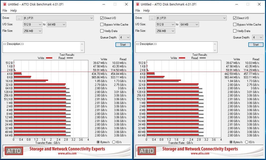 - 다만, 개인적으로.. ATTO 벤치의 경우.. 4k 미만 작은 IO Size쪽을 관찰하는데요.