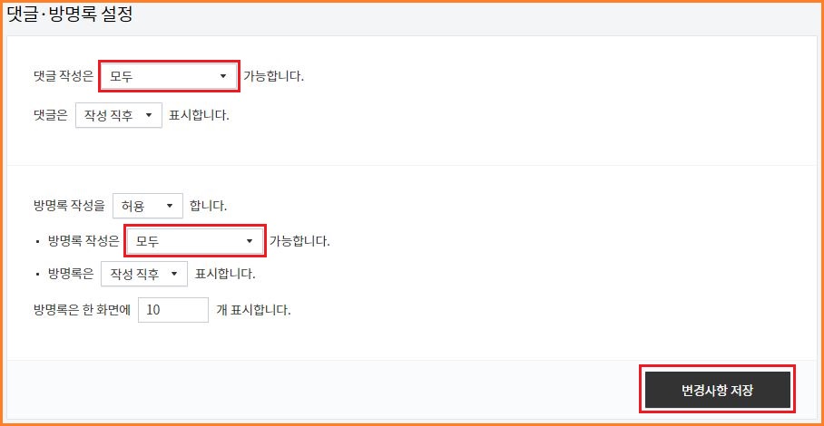 ㅁ 댓글 작성 설정에서 "모두"로 설정해 줍니다.