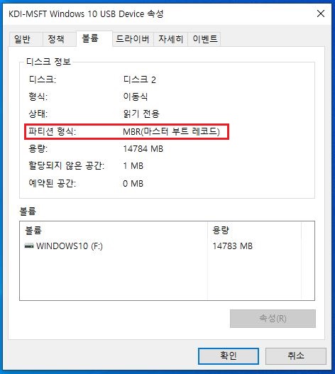 - 어떻게 하든 간에... 부트파티션을 Windows10 정품 USB메모리와 파티션형식을 동일하게 맞춰주면 됩니다.