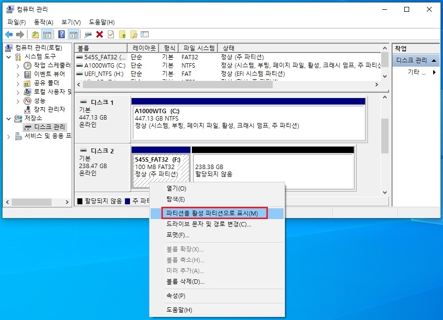 - UEFI방식으로 부팅시.. 디스크관리자에서 "활성파티션으로 표시"항목이 활성화가 안되어..