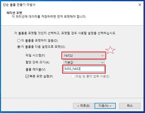 ㅁ (★중요!!) 파일시스템을 "FAT32"로 지정 후.. 이후 식별을 위해서 "볼륨 레이블"도 간단하게 지정해 줍니다.