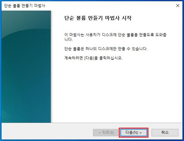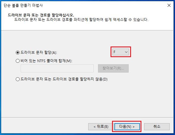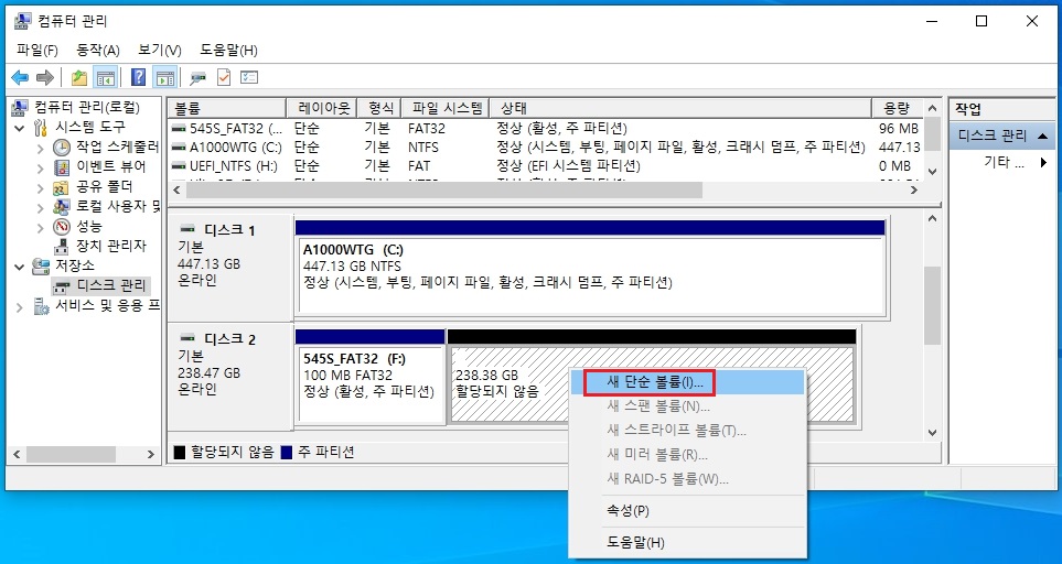 * 이후 디스크관리자에서 계속 진행하면 됩니다.