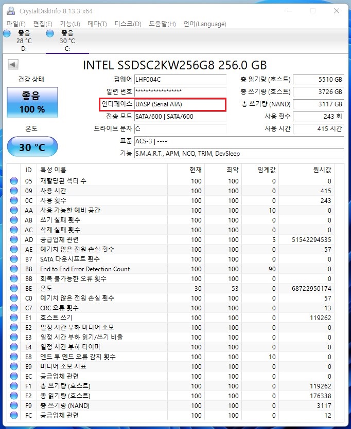 ▲ 다른 디스크 모두 분리하고, 인텔 545s 하나만 단독으로 연결했습니다.