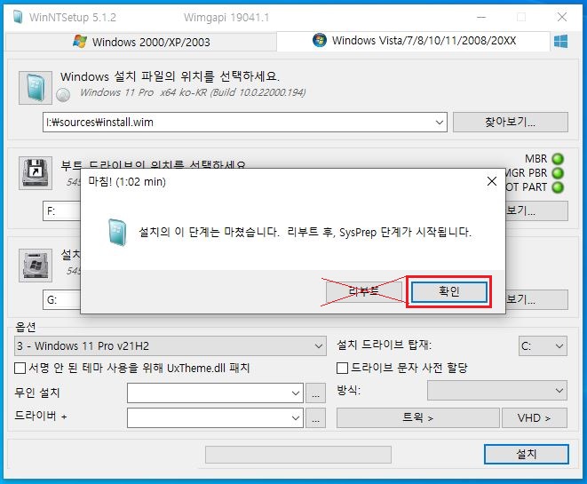 ▲ 경험적으로.. 리부트 하지 마시고, "확인"을 클릭 후 WinNTSetup툴을 종료해 주세요!!