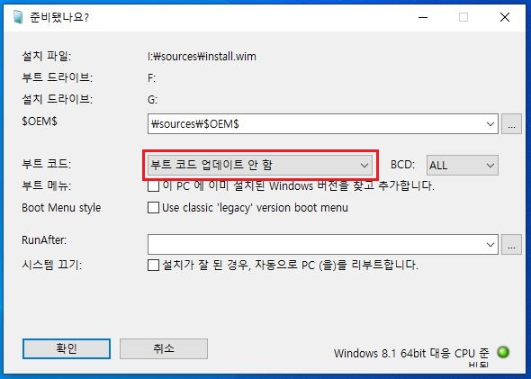 ㅁ "부트 코드 업데이트 안함"을 선택 후 "확인"을 클릭합니다.