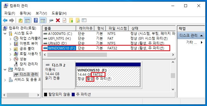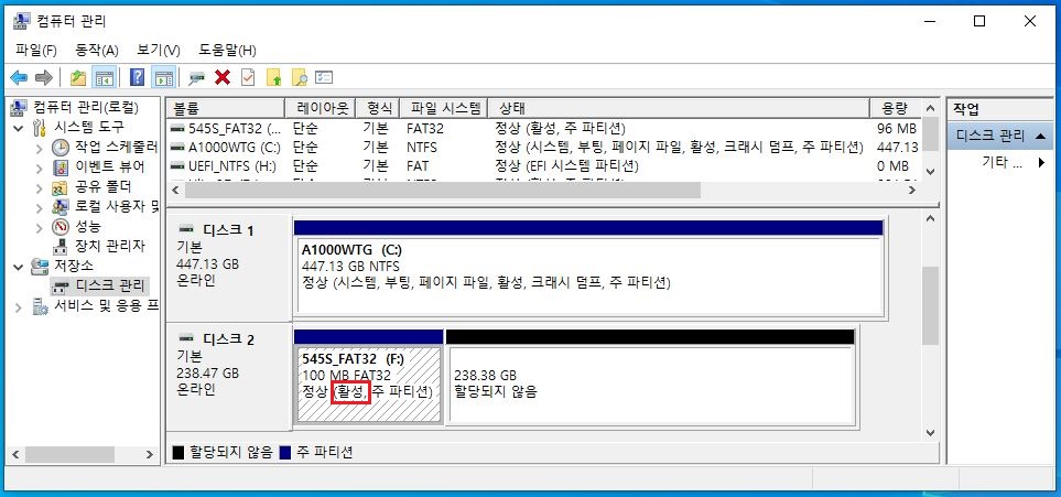 ㅁ 비로소 "활성 파티션"으로 표시된게 확인됩니다 ^^..