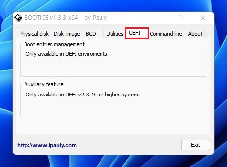 ▲ 부팅 후 Bootice 유틸로 확인해보면.. UEFI방식으로 부팅된게 확인됩니다.