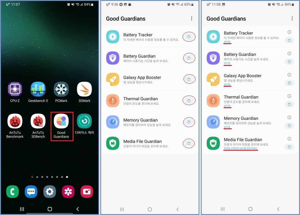 ▲ 굿가디언즈 어플 실행 후... 6가지 하위 애플리케션을 모두 설치해 주어야 합니다.
