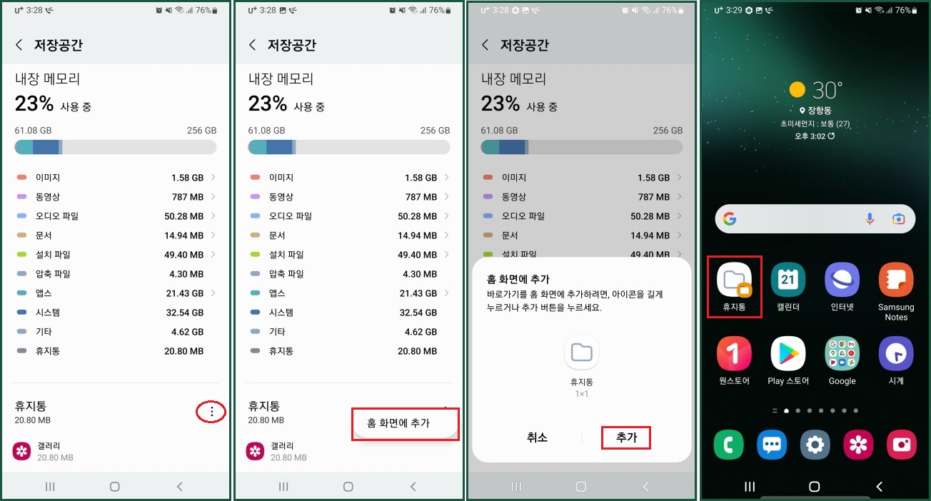 ▲ 저장공간 항목을 홈화면 추가하여.. 설정을 거치지 않고, 홈화면에서 직접 실행 할 수 있습니다.