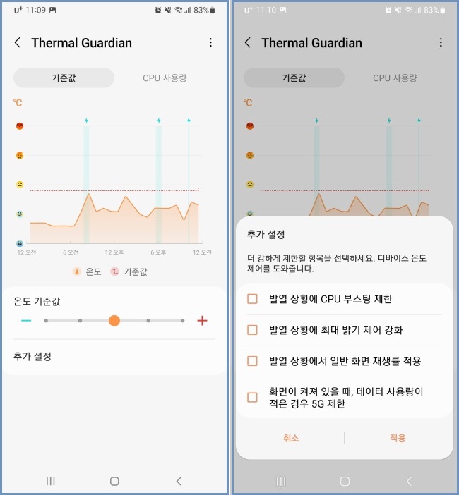 ㅁ 써멀가디언은?? 온도 기준값 및 추가 설정을 통해서 온도에 따른 성능제한을 할 수 있습니다.