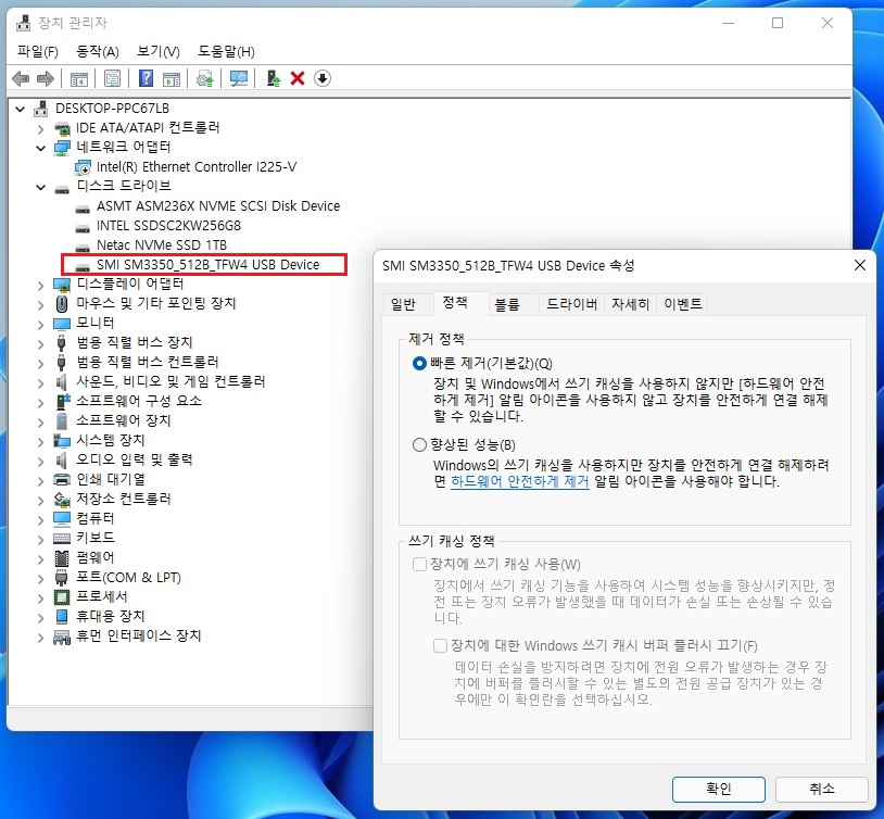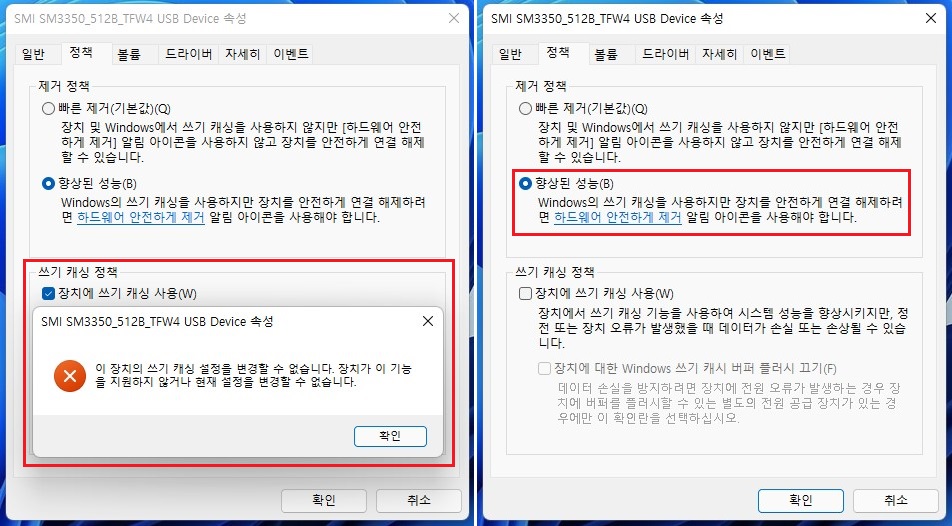 ▲ (좌) "쓰기 캐싱 정책"에 체크시 오류가 납니다만... 그러나, (우) "향상된 성능"에는 체크가 됩니다.