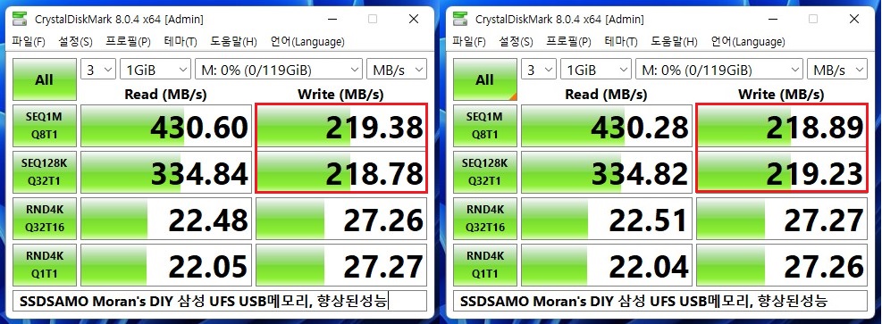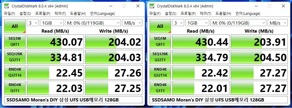 ▲ (의견) USB3.0 최대속도가 잘 구현되며, 연속 2회차 벤치오차가 ±1MB/s 이내로 벤치 안정감이 아주 좋네요!!