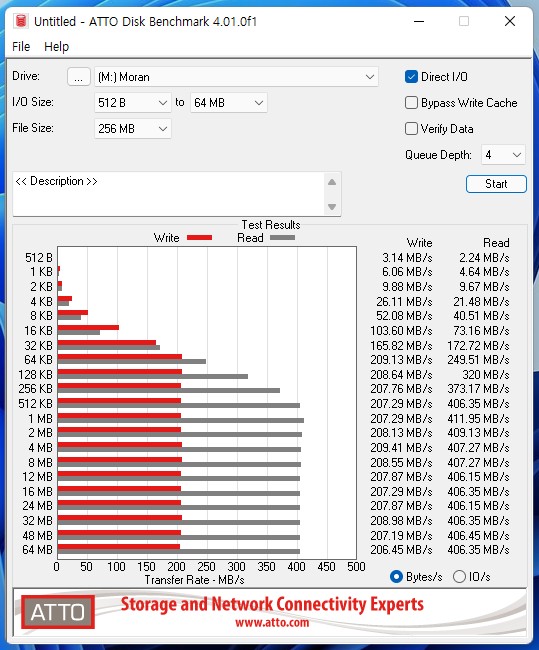 * ATTO 벤치마크는?? IO Size별로 Seq Read, Write 최대속도 특성을 확인할 수 있는 훌륭한 툴입니다.