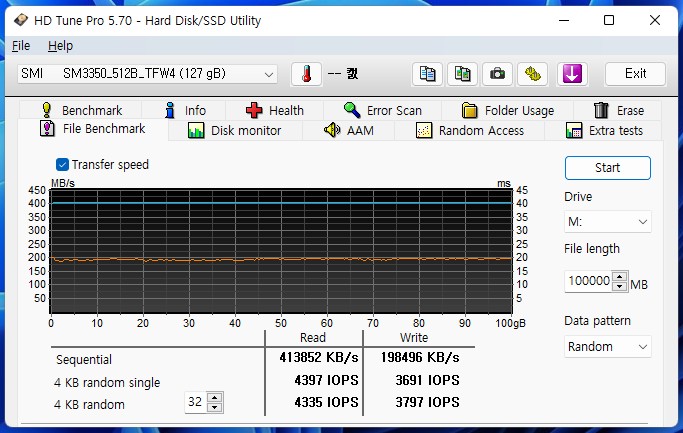 - (파랑 그래프) Test 파일 100GB Seq 읽기 속도는?? 413,852KB/s로 아주 안정적으로 보입니다.