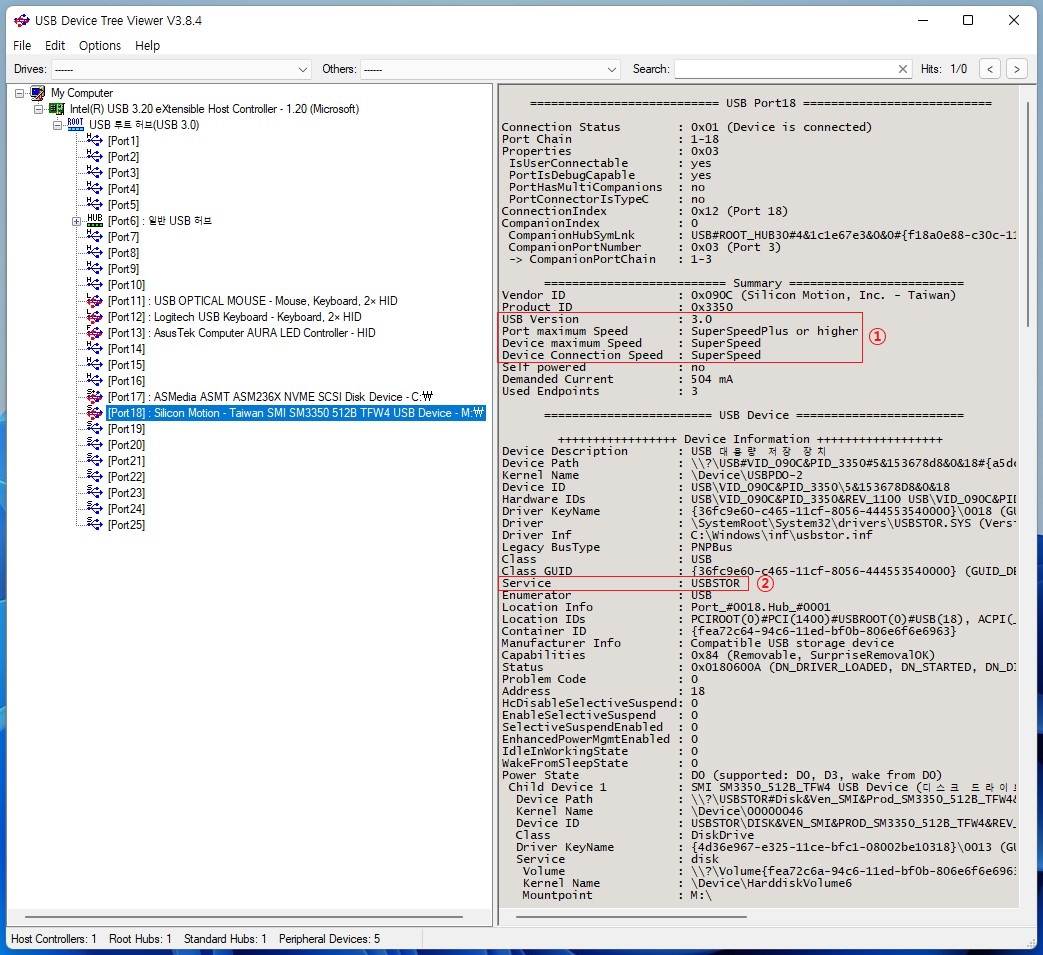 ① 포트는 USB3.1이며, 디바이스 최대속도는 USB3.0, 연결속도는 USB3.0으로 정상적으로표시해 주네요.