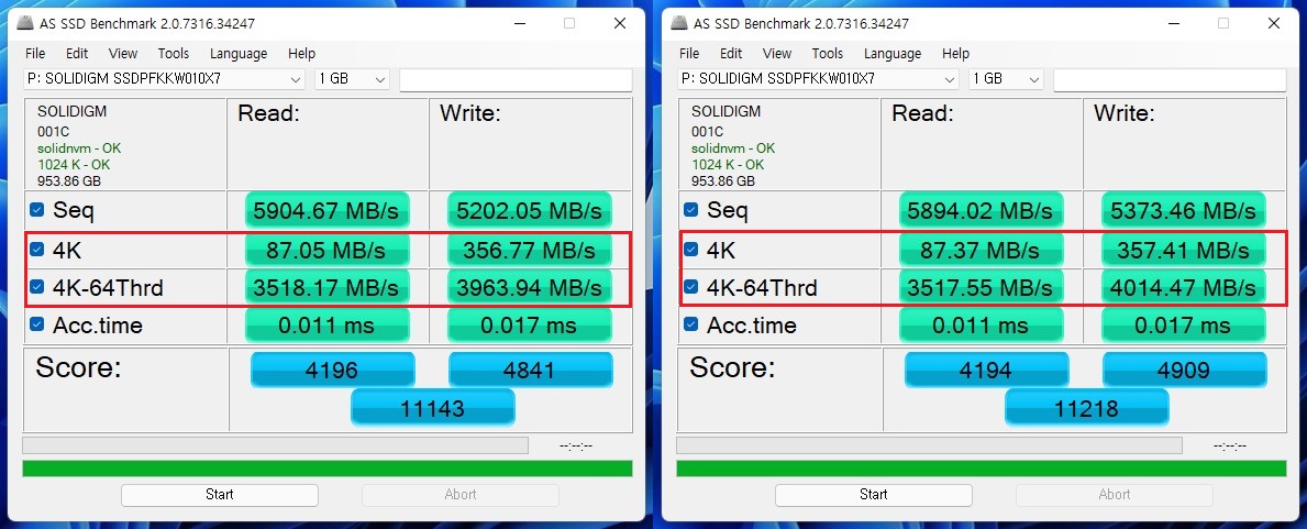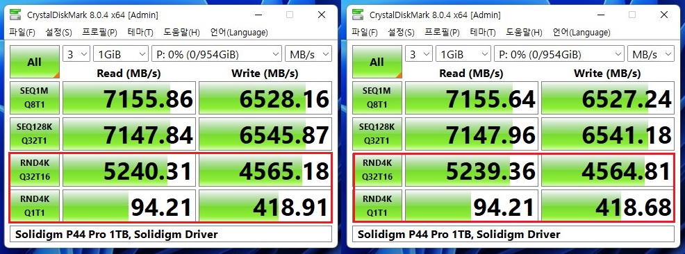 ▲ (의견) 솔리다임 드라이버 적용 후.. 4k Q1T1, 4k-64Thrd값이 눈에 띄게 좋아진게 관찰됩니다.