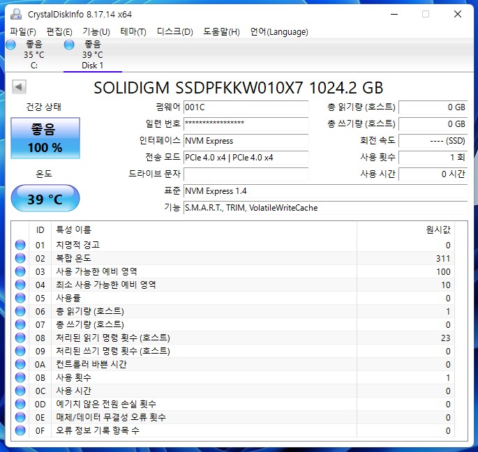 - 위 CrystalDiskInfo 이미지 체크 시점과 달라서 온도가 다르지만,,,