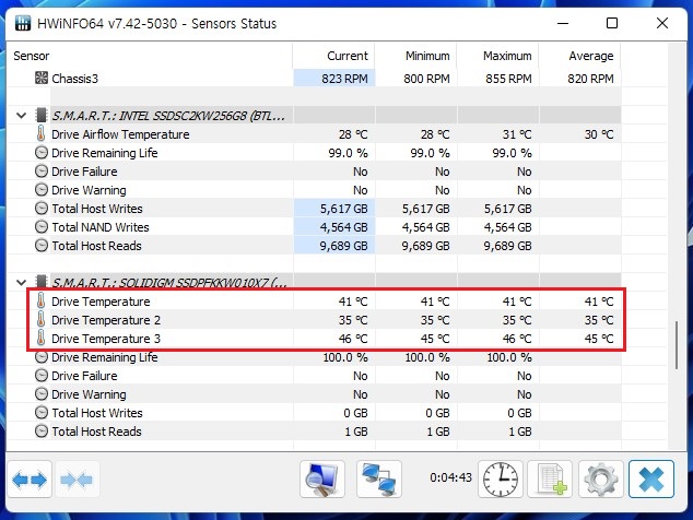 - 위쪽 Drive Temperature 항목이 CrystalDiskInfo 온도와 일치합니다.
