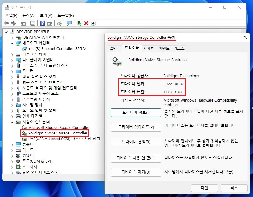 ▲ 솔리다임 NVMe드라이버 설치완료 후 장치관리자를 확인해 봤습니다.