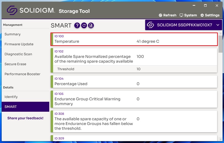 [ID100] 항목이 CrystalDiskInfo 온도와 일치합니다.