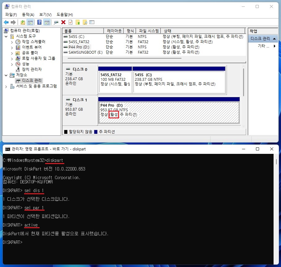 - 위와 같이 diskpart명령으로 주파티션에 활성(active)표시를 해주면 됩니다.