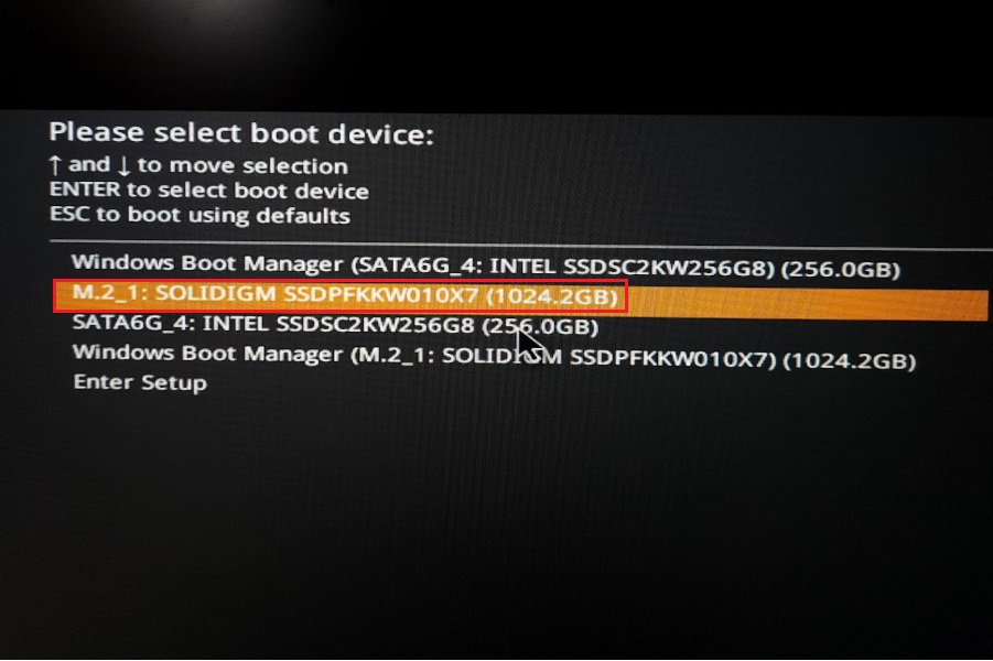 - 레거시 부팅을 위해서... M.2_1 솔리다임 P44 Pro 1TB를 선택하여 부팅해 줍니다.