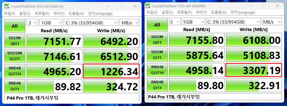 ▲ (의견) CDM 8.0.4 버전상에서 4k Q32T16 쓰기값이 다소 낮게 나오는데요.