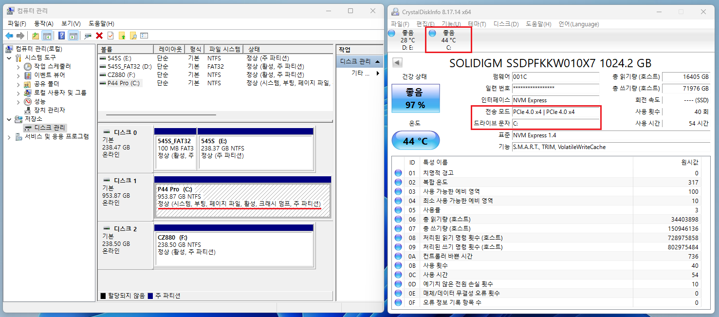 ▲ 정상 부팅 후 디스크관리자 및 CDI를 보면.. 레거시 방식으로 정상적으로 부팅된게 확인됩니다.