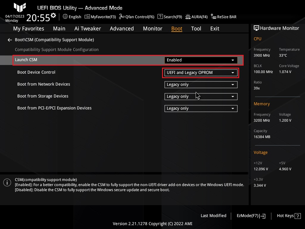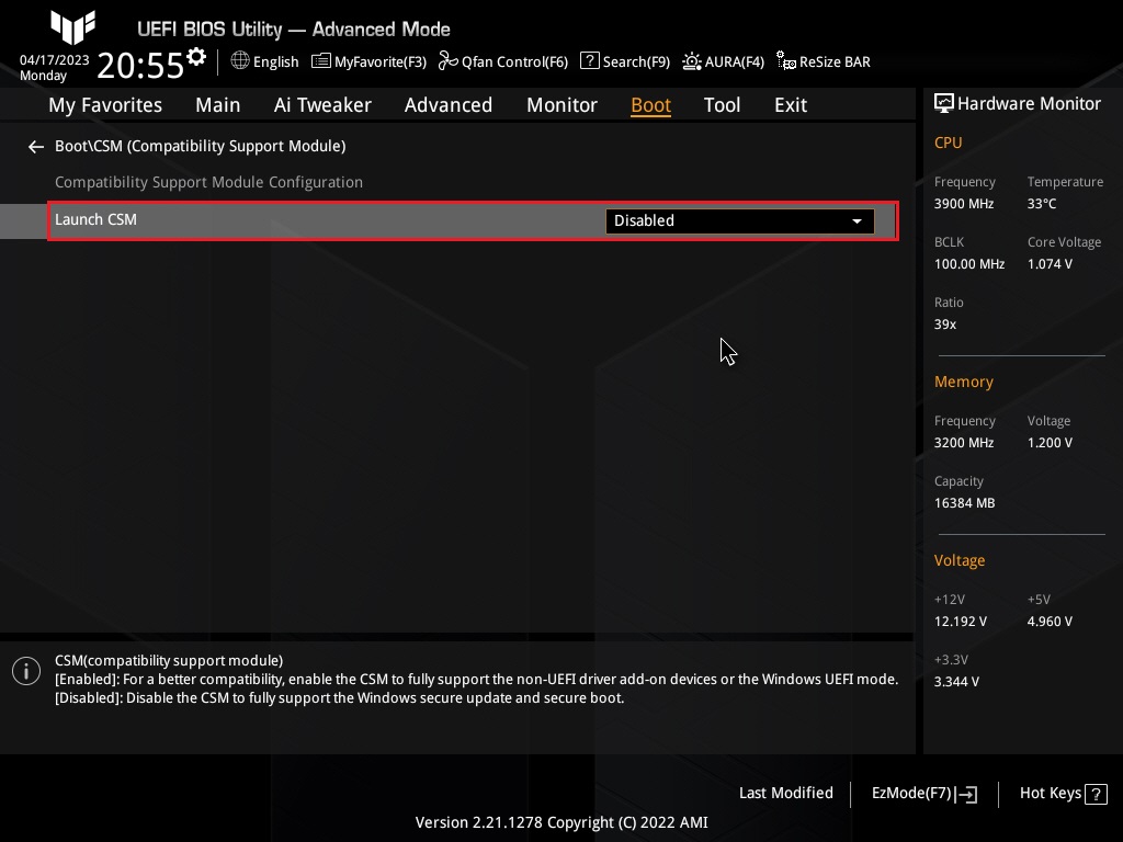 ㅁ Launch CSM항목을 "Enabled"로 설정해 줍니다.